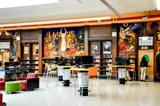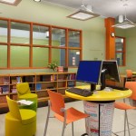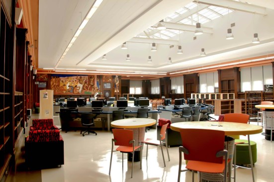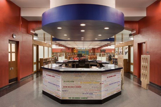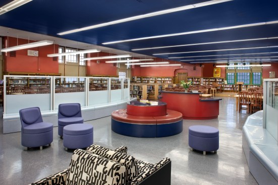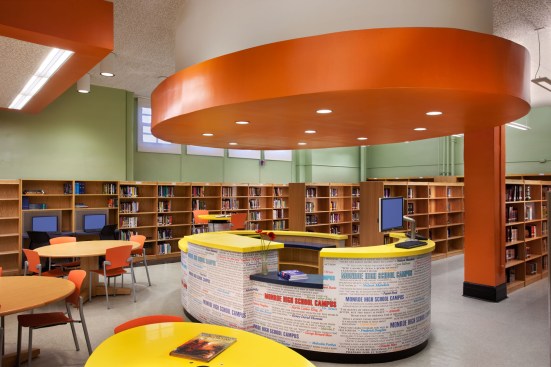 di Domenico + Partners was retained by New Visions for Public Schools in association with the NYC School Construction Authority to design new high school campus libraries throughout the Five Boroughs. The new libraries are shared among multiple high schools housed in the same building/campus, and move beyond the stacks and classroom standards in NYC schools. An inclusive design process involving dD+P, New Visions, NYC SCA, librarians, teachers, and students, brought about a program including diverse areas such as Chill Zones, Flex Space, and an Information Hub. Improved lighting and acoustics, new furnishings, color and texture, and sustainable elements such as the use of existing furniture and materials were included.