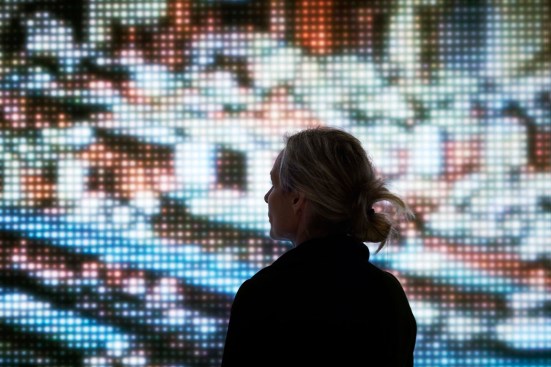 At both ends of a long connective corridor, we designed LED displays with bespoke screens to present “pixelated images” that draw the visitors into the galleries. Seen as “art piece” not a conventional slide show, images become more abstract as one approaches.