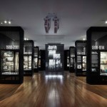 Artifacts and large-scale media are embedded in a bold armature of constructed chronology. Each of the eight niches has “jewel boxes” for archival objects floating above supportive documents. At the rear, a large projected image of the past dissolves to today’s view of the same location, engaging the visitor. Interactive “totems” highlight discrete, unexpected, people and objects, bringing the past to life.