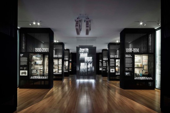 Moving image dominates a dense presentation of over 400 artifacts. At the center, projections onto scrim use thematic audio of music and voice to portray the excitement of the city. Content emphasizes harsh realities of 20th century challenges mixing iconic characters with untold tales. Visitors touch silhouettes of people with embedded imagery to unpack further content via a large-scale interactive presentation. Black background with reflective, perforated and luminous treatments makes for a dramatic interface with historic objects.