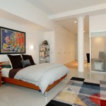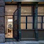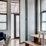 The kitchen, dining, and lounge spaces flow seamlessly to the private areas on both levels. A folded glass and metal privacy screen at the street level entry cleverly shields the apartment from street view. At the rear of the reconfigured upper level, a series of 11-foot high, fully retractable, glass and steel-framed door panels separate the new guest powder room and compact master bedroom and bathroom suite.