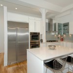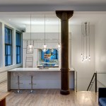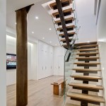 The design and fabrication of the staircase to meet code and child safety requirements presented the project’s most significant challenge. The staircase’s co-planar, clear-tempered glass rails and childproof open slots elegantly comply. A sizable post concealed in the wall support the welded bent steel angles, attached with moment connections. A fumed rubio-monocoat finish on the red oak wood flooring of the floating stair treads and throughout both levels lends warmth to a graphically neutral and steel interior. For a unique handcrafted industrial appearance, masterly Korean tanker warship metal fabricators forged all of the project’s metalwork, including the stair supports and door panels, on site.