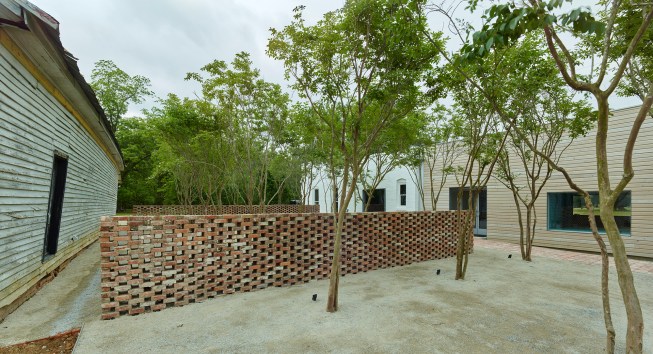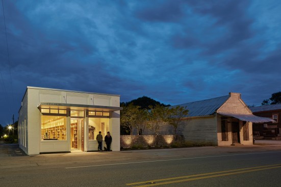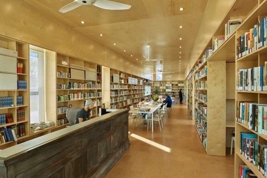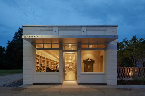 The Newbern Library, designed and built by four 5th-year Auburn University architecture students at Rural Studio, is an adaptive reuse project of a bank building built in 1906. The preserved masonry shell of the existing building contrasts with the addition, which is clad in local cypress siding. Bookshelves center a new space within the width of the old building, creating a room where readers are immersed in books. The modular bookshelves are made of birch plywood, CNC-milled, finished, and assembled on site. Complementing the larger public space, a series of alcoves within the bookshelves accommodate computers, private study nooks, window seats, storage closets, bathrooms, and access to the outdoors. The artifacts from the original building, such as the old heart pine floors and bank vault door, were repurposed and preserved inside the new space. A courtyard to the north of the building provides library patrons with shaded outdoor reading and activity space. The Newbern Library was completed in May 2015.