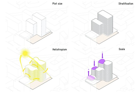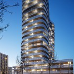 The building’s volume compliments the surrounding scales through its sculpted effect. The construction of intermediate landings creates a sequence within the volume and the piston-like morphology facilitates a graduated system of high-rise living. Its strategic position and impact on the site offer a range of interpretations depending on one’s proximity to the building, evoking multiple responses and sensations.