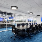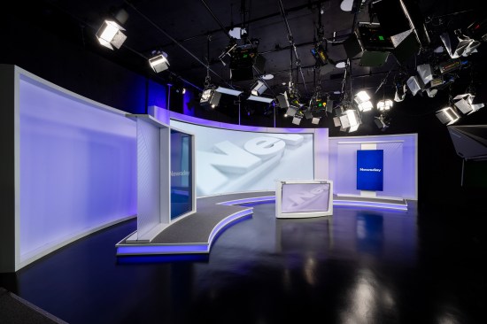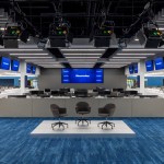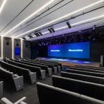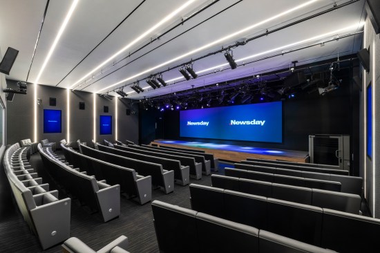 The interactive multimedia space at Newsday’s new Melville headquarters is geared towards celebrating local community events such as high school scholar athlete award ceremonies, Long Island business leader awards, and other similar events. It is also the new home to the Newsday Live series, promising to deliver high quality video productions with a more intimate audience experience. Inside the interactive multimedia space, guests see the signature Newsday blue against the back wall and a stage made of soft oak planks, featuring a large screen for presentations. The side walls are made of a textured wrap panel with integrated TV screens to amplify their tech-driven design. Newsday plans to rent out this space to outside groups, which can accommodate up to 186 people.