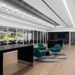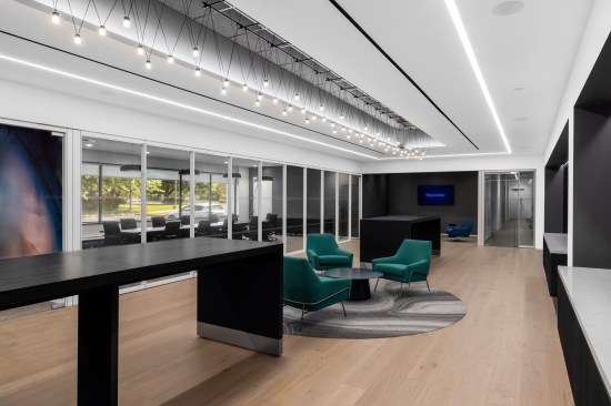 Within the workstation areas, employees sit in bench seating with access to lots of natural daylight. Since the floor plates are large, the design team included collaboration pavilions to help employees orient themselves around the office. These open collaboration zones are usually situated near the window and offer a mix of open and closed spaces, lounge seating, and small huddle rooms.