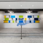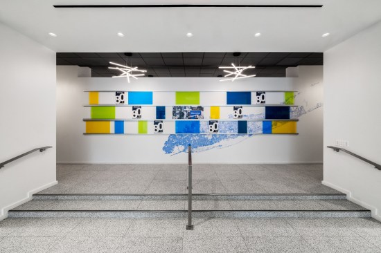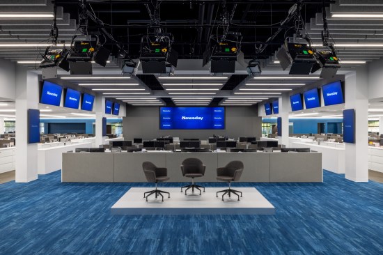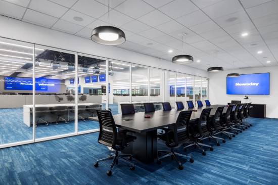 This headquarters relocation also allowed Newsday to consolidate and bring their staff together. Additionally, employee care was paramount, and they wanted their team to feel that they were moving into a comfortable work environment that suits their needs today and in the future. The design has a strong technology-infused, modern feel that gives the workplace a fresh and forward thinking atmosphere. Throughout the project, it was important to find fun, dynamic ways for the design to support Newsday’s strong tether to the local community using branding and graphics, community photography, and art installations. Incorporated into the design, the team created a large-scale art installation that features published Newsday photos printed on metal panels outside the main entrance. The photos were taken on Long Island and either used in print or digitally. The panels cascade up the walls and onto the ceiling, giving off a strong sense of movement and motion. Additionally, next to the entrance, the Newsday logo shines proudly, and inside the main reception is a large media wall. Behind it is a printed map of Long Island—further driving home the publication’s strong tie to the community. On the other side of the office, there is another photo wall in the employee entrance that can easily be changed and edited. Staff can highlight the latest photography, feature articles, or other relevant work they want to share companywide. The broadcast studio is equipped with 4K/HD technology and a virtual set, including Augmented Reality that will allow Newsday reporters to broadcast from seemingly anywhere on Long Island.
