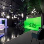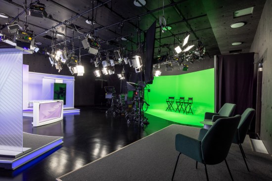 Within the newsroom, there is a flash cam area for quick camera pans to reporters during live broadcasts and streams—positioned right in the middle of the news hub, allowing staff members to feel like they are a part of the action. The work area is open, surrounded by large-scale TV screens to monitor the latest news developments and work. They also now have photo and video editing studios that can increase their digital and social media presence. Several portal features along the walls and ceilings help break up space within the main hub and provide further dimension. The large café is placed towards the center of the plan, and adjacent to the other entrance and surrounding it are lots of meeting and collaboration rooms that make this a bustling point of convergence in the office.