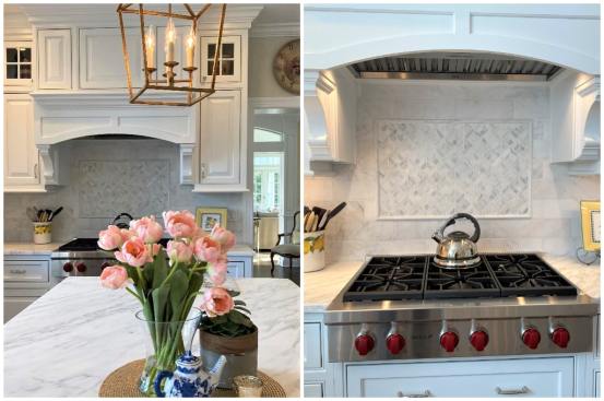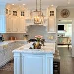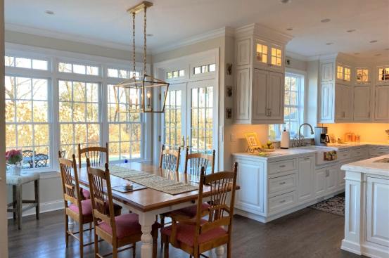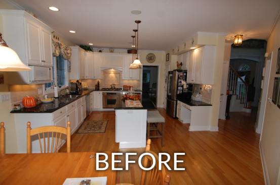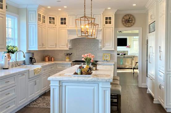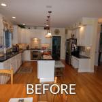 After much debate between whether or not to enlarge the kitchen, the decision was made to remodel within the existing space. The new kitchen features white raised panel doors, a white Carrara marble counter, a farmhouse sink, & high-end appliances.