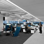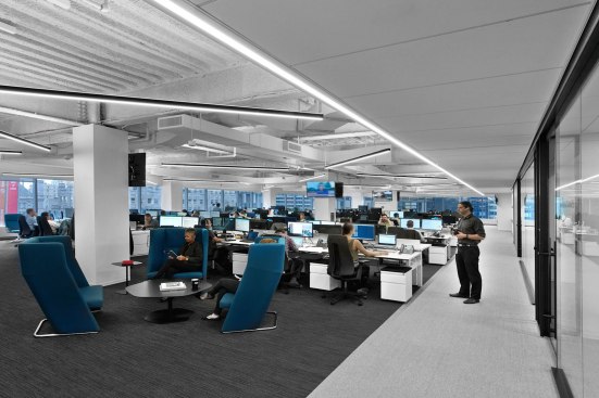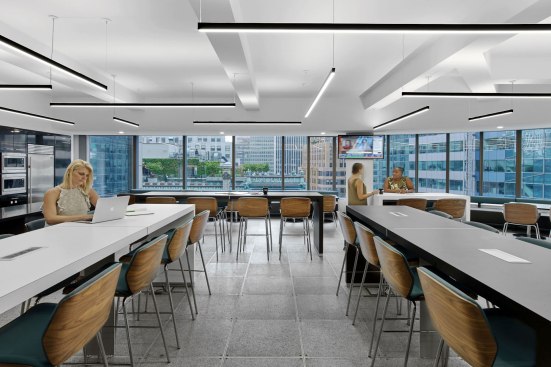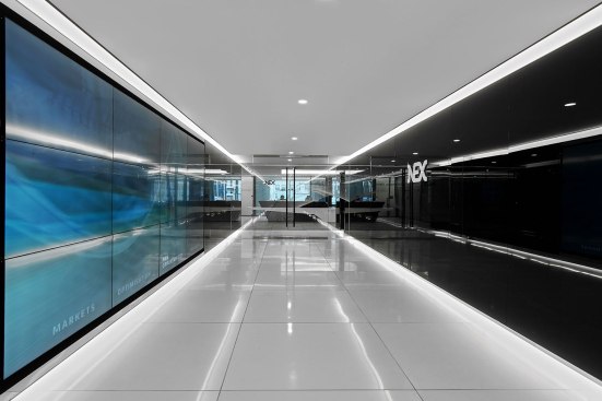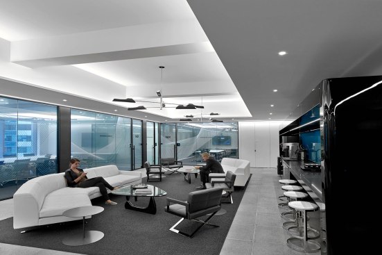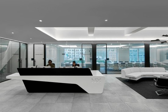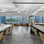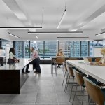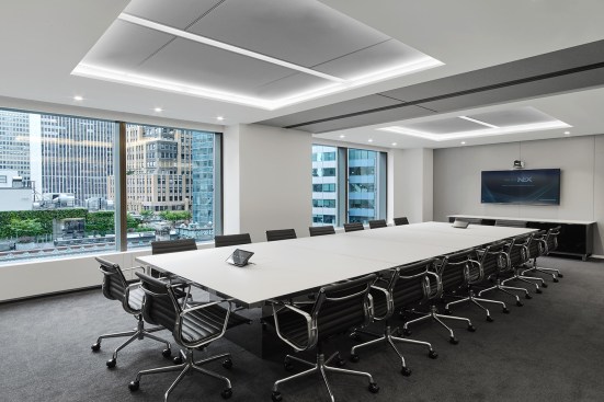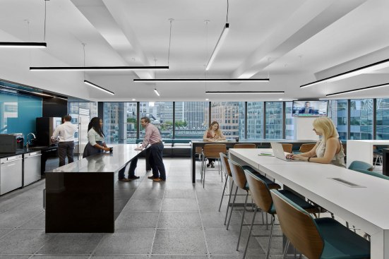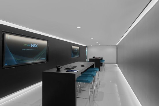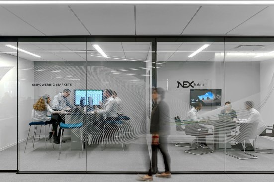 NEX Group is a UK-based financial technology company focused on today’s rapidly expanding post-trade and electronic markets business sector. TPG Architecture was awarded the opportunity to support a major consolidation and relocation of their various New York offices into a single North American headquarters central to their local client base at Midtown Manhattan’s iconic Times Square. TPG designed two contiguous floors at the newly-renovated 4 Times Square Building accommodating approximately 600 employees and covering nearly 83,000 square feet. TPG’s close trans-Atlantic collaboration with the client in London ensured a design that would fully embody NEX’s new and evolving brand identity. Technology was a driving factor for this workplace design, responding to both the aspirations of NEX’s tech-driven culture and the functionality of their business. An integrated multi-media wall in the lobby welcomes visitors with moving imagery. Flexible conference rooms feature switchable glass to provide instant confidentiality when needed. Connectivity is extended to amenity spaces to create agile working opportunities. Collaboration spaces are equipped with smartboards to allow for impromptu huddles. Modular planning, high-quality demountable and moveable partitioning, raised flooring, and complex pre-wiring provide future flexibility for a vigorous office environment with an emphasis on openness and dramatic 360-degree panoramic views for all. The various business units are joined through shared reception and conferencing facilities, café and refresh zones, as well as a marketing lab—all designed to NEX’s corporate branding standards. This “office of the future” reflects an emphasis on team-building and collaboration, championed by NEX’s progressive-minded leadership. The project has achieved LEED Gold certification.