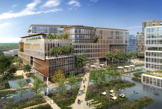 The design for a 35,000m2 multi-tenant building on a prominent site in Amsterdam incorporates three volumes arranged in a triad and lifted off the ground to create an open, permeable, and inviting ground plane accessible to the public. A central atrium space within the building serves as a hospitality-oriented urban living room, encouraging longer stays and more opportunities for interaction between people.