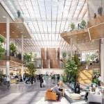 The atrium is alive with energy and light, trees and plants, and active with balconies, overlooks, meeting rooms, dining areas, exhibition space, flexible work areas, and places for casual interaction. The atrium is an amenity-filled ecosystem for creative collaboration and building community internally among the building occupants and externally with the public.