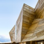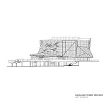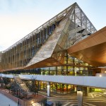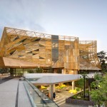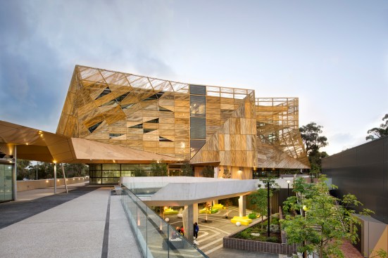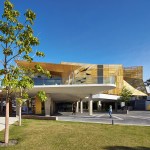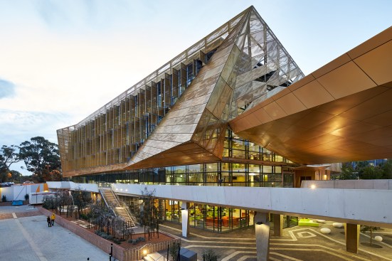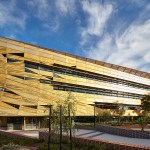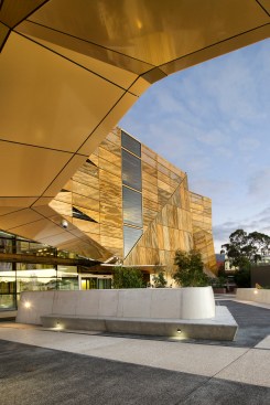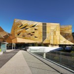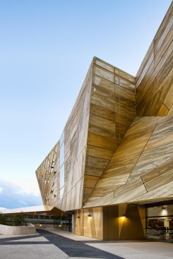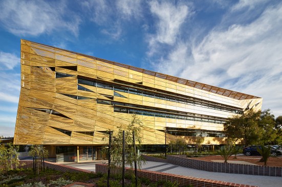 wonderful faceted concrete podium and a gold perforated aluminium sun-shading