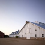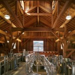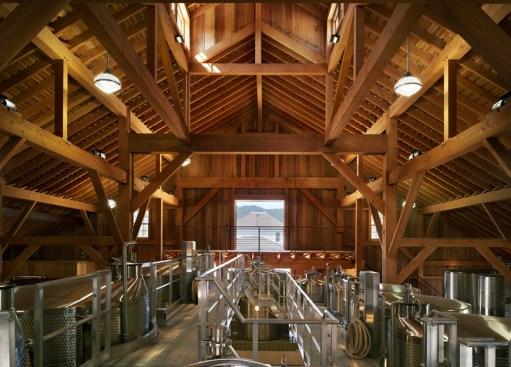 The 6,000 square-foot South Fermentation Barn is built with hand hewn fir beams, rafters and boards, and features traditional American barn-building methods. The wood-frame barn has been assembled using age-old techniques of hand-joinery for post and beam construction that were common in the 1800’s. Creative engineering enabled the barn to meet seismic building codes, while preserving its 19th century American Farmstead vernacular. The exterior is clad with western red cedar board and batten siding with a limestone wainscot.