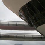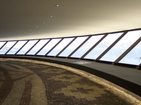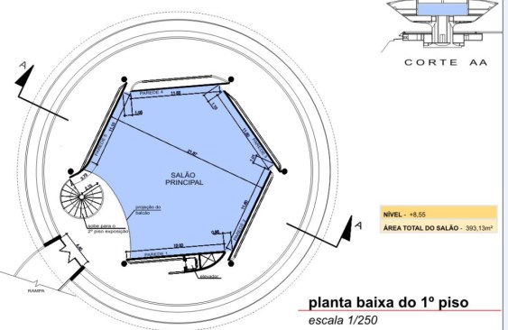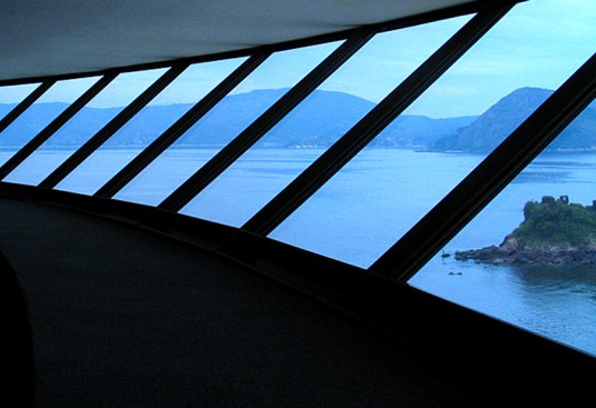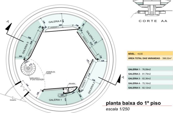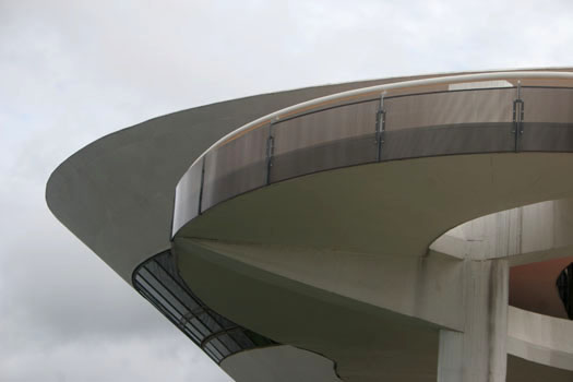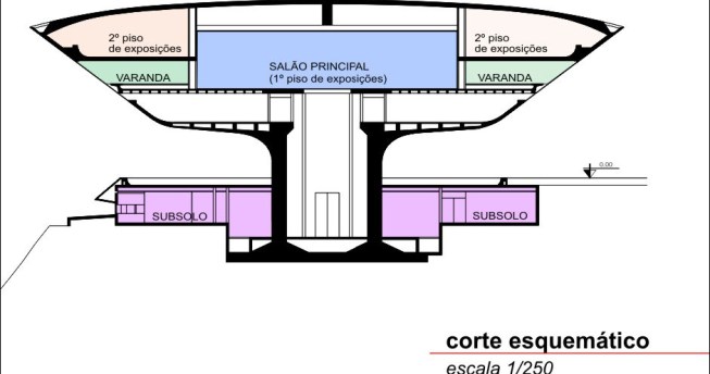 The circular shape covers 50 meters in diameter and area of nearly two thousand square meters, and received heat treatment and waterproofing. The large outdoor ramp red concrete leads the visitor through 98 meters of free curves in space, to the inputs of the upper floors. The first floor entrance is the reception and administration. Just above the second floor houses the central exhibition hall surrounded by a glass circular balcony, also aimed at exhibitions, totaling an area of thousand square meters, where you can admire the panoramic views of Guanabara Bay.