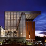 The 45-foot-high canopy at the north end of the building forms a gateway for the campus and a highly visible entrance for BRITE. A double-height lobby and monumental stair connect the two primary floors while parking for the facility is located to the west at a lower elevation.