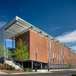 In contrast, the lab spaces situated along the west side of the building are shielded from glare and heat gain by a masonry wall with narrow vertical openings. Derived from the geometry of an unfolded DNA strand, the window pattern also reflects the University’s commitment to biomanufacturing education.