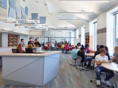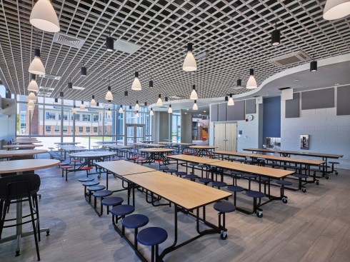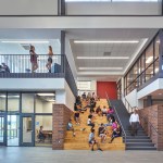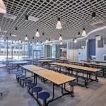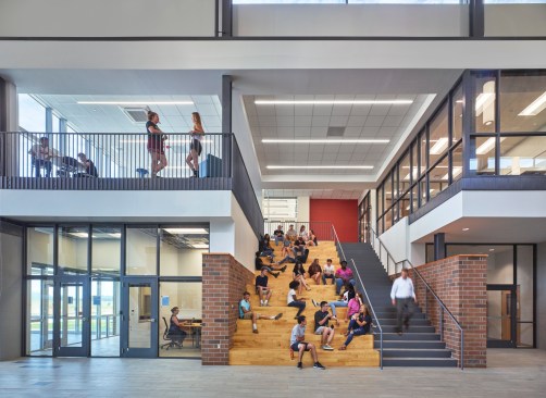 The replacement of North Dorchester High School offers a tremendous opportunity for Dorchester County to advance learning and teaching to a new level. Following a feasibility study that recommended the replacement of the school, HCM partnered with the County to develop the Educational Specifications for the new facility. The community and County leadership helped define planning principles and other key drivers, which helped to influence the design of the new 117,150 sf school. The new predominantly two-story school is located on the northeast corner of the site. By doing this, the full site – high school and adjacent middle school – will function as one large community asset. The two school buildings bracket a new and improved community athletic and recreation complex, complete with new or improved fields and track facility. This also allows the project to be built without the loss of any major site functions during construction. The southern portion contains the dining commons/food service, athletics, and auditorium, all organized around a central gathering space that will serve as pre-function space for these large public use spaces. During the day it will also provide general circulation, large-group meeting space, and additional student dining space. It will also provide formal and informal learning spaces, highlighted by a learning stair. The northern two-story wing contains academic classrooms organized in an “academy” layout with similar subject areas grouped together. English, History/Social Studies and Foreign Languages are grouped together to form a Humanities Academy on the first floor. Science, Technology, Engineering, Arts and Math disciplines are grouped together on the second floor to form a STEAM Academy. The two wings are connected by a two-story section of the building that contains administration, health clinic, nurse’s suite, and guidance on the ground floor and learning commons, technology education, and art on the second floor.