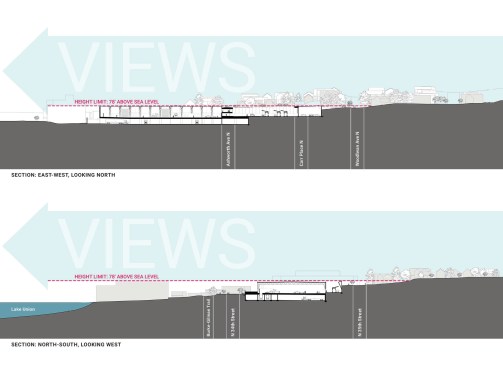 To mitigate impact on the surrounding houses, the top of the complex was capped at 78 feet above sea level, which matches the highest point of the site at its northeast corner. This allowed the houses above the facility to retain expansive views of the lake and downtown Seattle.