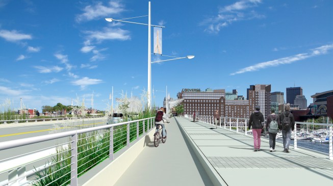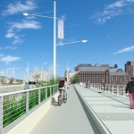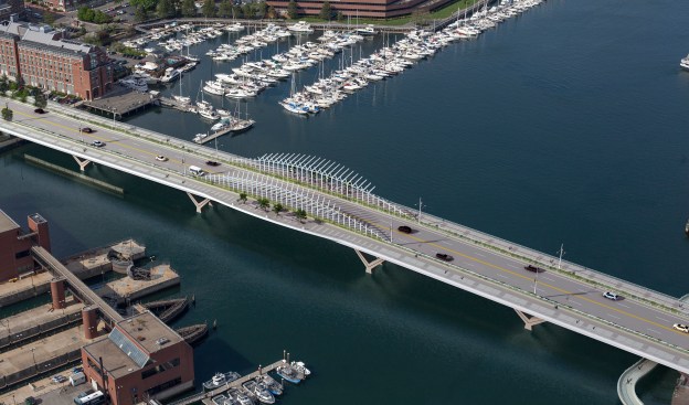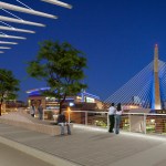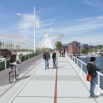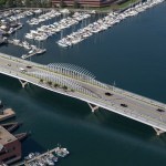 The new North Washington Street/Charlestown Bridge will replace a century old truss bridge over the Charles River. The new bridge will include wide sidewalks – 12’ and the first cycle track – 7’ in width on a bridge in the City of Boston. Almost 40% of the width of the bridge will be dedicated to pedestrians and bicyclists which will make it try multi-modal and one of the most innovative bridge in the US in this respect. The design of the elegant piers and overall architecture is inspired by the adjacent Zakim bridge without mimicking it to complement rather than detract from the iconic bridge. The new bridge with spans up to 200’ will also include curved overlooks and open space at the center navigation span with seating, a shade structure and landscaping for users to enjoy views of the harbor and the city.