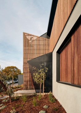 Our clients sought to respect the existing single level character of the suburban court by minimising the visual impact of their double-storey home. Timber screens were used as a device to soften the solid rendered walls behind and to unify the facade.