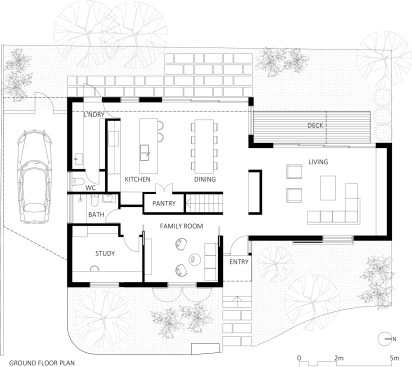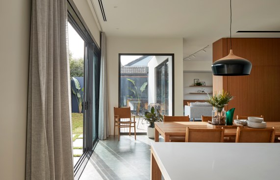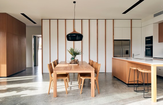 A desire to avoid harsh materials prompted an environmentally friendly interior that uses oils instead of paints, polished concrete slab, and naturally oiled spotted gum stairs and flooring.
