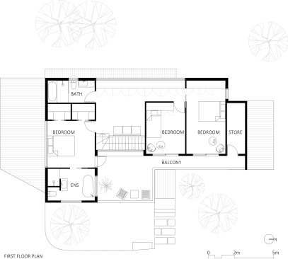 The downward sloping external timber screen compresses the frontage, giving the illusion of the house bending toward the ground. A spacious first floor balcony, enriched with potted plants, faces the street to create natural rather than built skyline. The balustrade’s lowest point faces the street, and combined with the sculptural entry canopy gives a gentle nod to the surrounding houses.