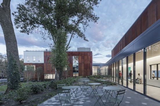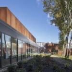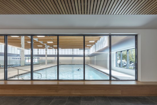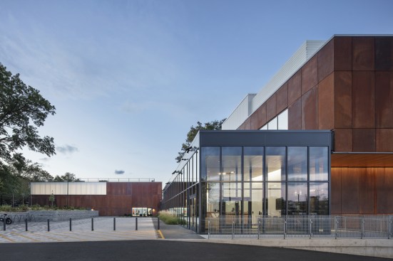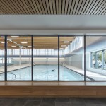 The material palette is inspired by the Bronx’s natural landscape. The main pavilions are clad in weathering steel, which ages gracefully over time. Natural wood ceilings in the lobby and corridors connect the interior to the landscape. The design balances aesthetic appeal with the durability needed for a high-traffic facility. Notably, the pool area uses glulam beams for their beauty and corrosion resistance, and fabric ducts replace bulky ones to create a pleasing ceiling design for swimmers.