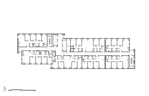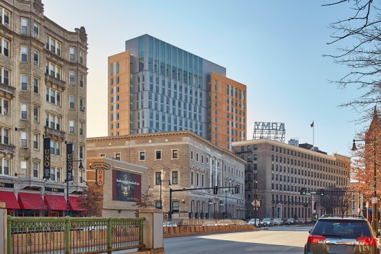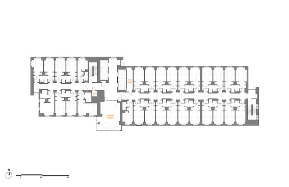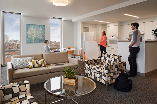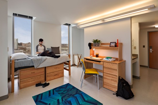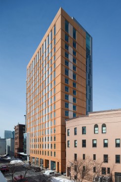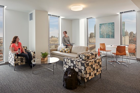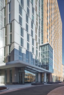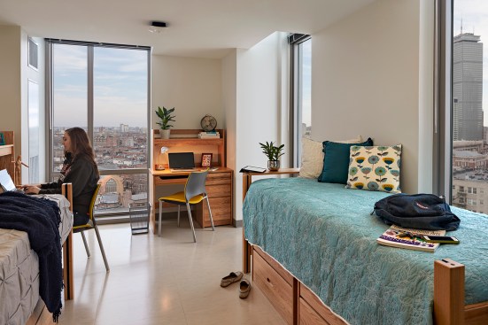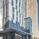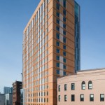 This 17-story student residence hall, occupying the site of the former YMCA gymnasium in the historic Fenway district of Boston, houses freshman Honors Program students in traditional dormitory units and upperclassmen in apartment style units. The design concept for the building stems from the dense, urban site at the eastern edge of the university campus. This location offers offering an opportunity to respond to both the city and campus with a more transparent expression at the building’s opposite corners. The exterior massing and skin of the building brings a renewed vitality to the existing urban fabric, while also being sensitive to the existing context of the campus and surrounding neighborhood. A multi-function event space located on the 17th floor provides spectacular views of the city and campus. This project was the first privately-developed student residence hall delivered in the Boston area. It helped the university meet its housing goals, provided additional revenue (from the sale of this parcel) to the YMCA for much-needed renovations and improvements and enhances the university’s urban visibility at the eastern edge of the campus.