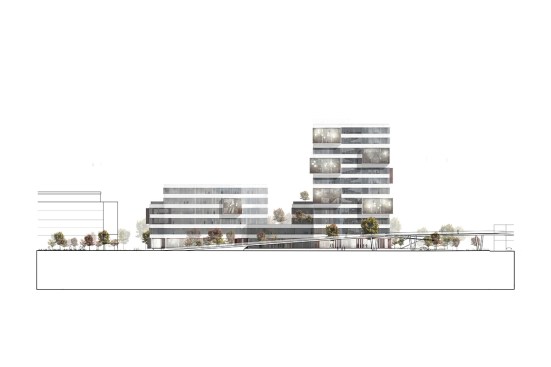 The building’s facade and its framed openings create great transparency, inviting sights from the outside and optimizing the intake of daylight. Roof terraces, solar panel systems and green roofs make up the building’s horizontal surfaces.