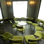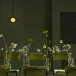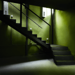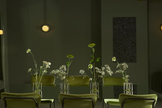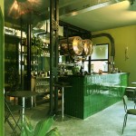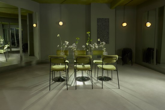 The color palette primarily consists of warm gray tones and mossy green, creating a welcoming ambiance. Lighting has been designed to accentuate the metallic structure and offer a range of atmospheres suitable for different times of the day or specific events.
