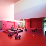 The building marks the entrance to a small village nestling in a valley in Alsace. A 14th-century castle dominates the site from the nearby hillside. The day nursery echoes the orthonormal geometry of the fortified castle. A perimeter wall with openings like on a castle wall protects the children’s playgrounds. This spatial arrangement offers views of the rounded outlines of the Vosges mountains. The principle of the strictly rectangular plan is an arrangement of successive crowns containing the elements of the project. These layers give depth to the project overall. The heart of the building is formed by a central space which emerges at double the height and plays with natural light like a kaleidoscope. This almost cubic volume condenses a host of faces ranging in color from pink to red. The matte and shiny colors resonate, shaping the space to make it richer and more subtle.