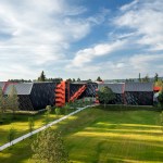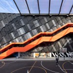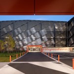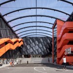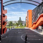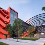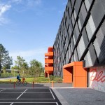 Themes of movement and bold ideas are expressed through the garage’s massing. The structure is split into four 60-foot parking bays, with each bay expressed separately from the next and resulting in an undulating roof and end walls. The massing breaks, highlighted with bright orange metal panels, make the structure appear to be springing forward—emphasizing athletic movement and bringing the facility to a human scale. Part of the central bay is carved out to allow daylight penetration and to create a covered outdoor courtyard for sports activities, community gatherings and special events on campus.