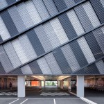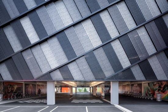 The garage’s choice of materials and wayfinding techniques also contribute to themes of movement and athleticism. The cladding is simple, corrugated metal panel with a custom perforation featuring Morse code for the company’s trademark slogan; the code runs diagonally across each façade in four colors in four different positions on a custom aluminum extrusion. The metal panel siding hides cars from view, and the custom perforation and undulating geometry add movement to the façade while allowing dappled light to penetrate the interior. Linear skylights provide an abundance of additional daylighting and brighten the garage.