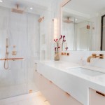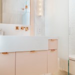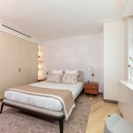 Hidden within the cream lacquer cabinetry in the south eastern part of the home is a well-outfitted kitchen equipped with high-end Miele appliances and custom high-gloss lacquer cabinets finished in a daring, but subtle, lavender hue. Stunning honed marble begins at the counter and cascades up through the backsplash. Directly opposite of the kitchen and through the hall is a beautifully secluded gem, the lavishly designed bathroom accessed through a custom metal and glass door. You are immediately enveloped in a space that shimmers in Dolomitti marble with staggered rose mirrored slivers on the floor, cleft Thassos mosaic featured walls from Artistic Tile, and finished with rose gold Dornbracht plumbing fixtures and matching hardware. The custom lacquered vanity and large framed mirror anchor the room with beautiful crystal-like sconces from The Bright Group. The cabinetry separating public and private spaces is a rift American Walnut that houses various functional components such as closets, storage, a concealed bar and wine refrigerator, and television niches in both the living room and bedroom – all while allowing the area to retain its elegant aesthetic. The living room niche is surfaced with a three-dimensional metal mosaic from Porcelanosa and serves as the television backdrop. Sofa from B&B Italia, customized Doris Leslie Blau area rug and Kravet drapes, with a rare sculptural-like Wendell Castle coffee table that helps soften the clean lines of the architecture and distinguishes the living from dining space, making it a true conversation piece. The cylindrical glass top dining table on a curvilinear stainless-steel base by The Bright Group is paired with Natuzzi Italian leather chairs and centered on a custom bookcase, anchoring this dining area. The bedroom is accessible from both sides of the room, enhancing the sense of the space and light. The Poliform bed is woven suede with warm rosewood side tables from KGBL, Cataldi ivory leather reading lights set upon an eye-catching Bradley USA wallpaper with angular rose gold lines, threading all materials throughout the entire space together in one room. The custom cabinet that encloses the new air-conditioning system also serves as a writing surface, complete with a SKRAM saddle stool, creating the perfect spot to take in the expansive metal and glass fenestration and New York City streets.