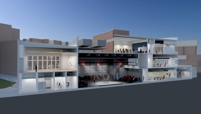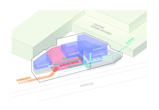 The proposed Performing Arts Center at Susan Wagner High School in Staten Island, NY addresses an overcrowding issue for over 3,000 students. di Domenico + Partners’ design utilizes additional academic and specialized spaces for the school’s theater and arts program, providing an independently operational black box performance space for rehearsals and specialty productions with the requisite support, practice and storage areas. The building and site design, which are developed with dual usage and access in mind for both the school and the community, are intended to exceed a comparable LEED Silver rating.