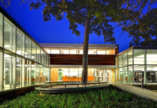 The library today includes a 4,500 SF addition and the completely renovated 7,500 SF original. New adult and teen wings define a neighborhood pedestrian entry and outdoor reading room under mature oak and pine trees on the west. Within the original volume, staff areas, conference space, restrooms and mechanical areas occupy a new service zone to the south, giving the children’s area access to natural light to the north. The original tile mosaic and globe light canopy of the old circulation desk were restored to create a toddler-sized reading nook. Lobby space, lit by a continuous shaded clerestory, occupies the seam between old and new and unites the two entries.
