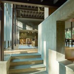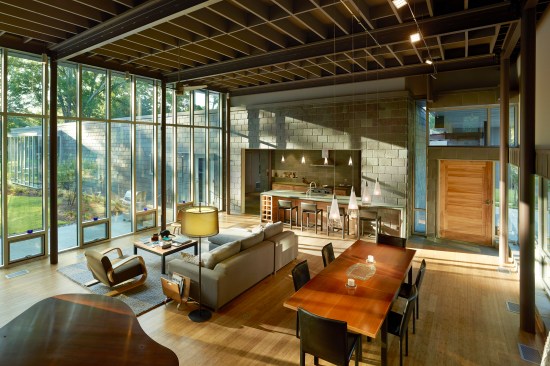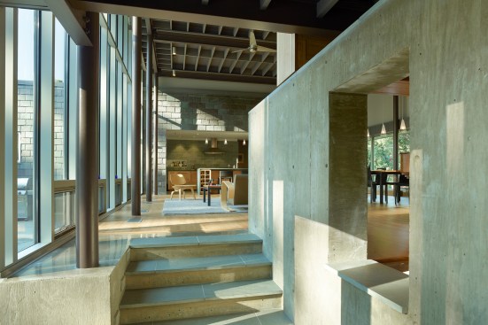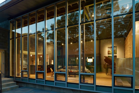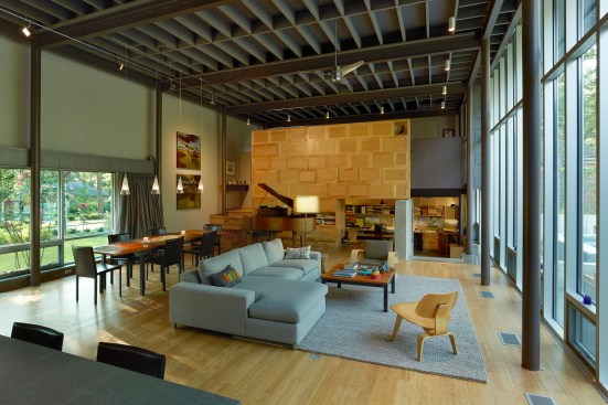 The house is shaped to draw the outdoors in and lure the family out. The public/living space is a vessel of light. It awakens the house with a vibrant play of morning sun, then settles into a wash of reflected daylight until its afternoon encore prepares the house for the evening. Time seems to expand. The room is never simply an interior. Boundaries of space are indeterminate, alive and negotiable. At night and from the inside, a view of the room is projected out into the trees. From the outside the trees and the sky are cast into the house. These expansions and interpenetrations soften the boundary of the room fostering a constant invitation for measurement and negotiation..