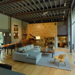 Materials and assemblies were chosen for character, economy, sustainability and durability. The structure is exposed throughout the interior and provides texture and pattern, enlivening interior surfaces and limiting the need for “coverings”. The wood frame walls are taped and coated with a high-performance water/air barrier. Over this sealed surface, slate and zinc shingles are layered to shed water. A double-shell roof over the living wing is finished with a standing seam zinc outer skin.