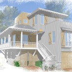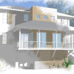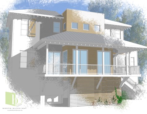 A narrow lot, flood zones, and great views helped shape this design for an elevated home. Vernacular design elements such as large porches and wood shutters are mixed with low maintenance metal siding and roof top decks to blend a house that fits into the lowcountry vernacular; while firmly standing up for its individuality.