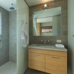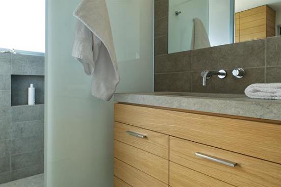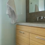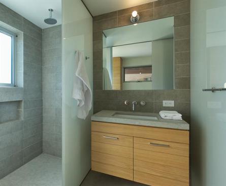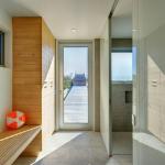 Transitional spaces like entryways sometimes get ignored, but not this one, which is put to good use as a bathroom that takes up less than 100 square feet. A private space occupying an entryway? Not a problem. Stelle Architects divided the bath in two, separating it with the hallway. Toilet, shower, and sink are on one side, with a pocket door and sandblasted glass panels that allow for privacy when needed. On the other side of the hallway is a bench, bookended by floor-to-ceiling cabinets that utilize much of the entryway wall space as storage for the bath. Instead of being built flush to either side, the bath’s vanity is hung and has space on either side of it, giving a feeling of spaciousness to a little room. Stone tile and oak cabinetry riff on the color palette of the beach, and the slatted bench has the look of the boardwalk. Like the other award-winning rooms in the house (Ocean/Bay Residence won a grand award for its master bath and a merit award for its kitchen), the architects let the environs guide them.