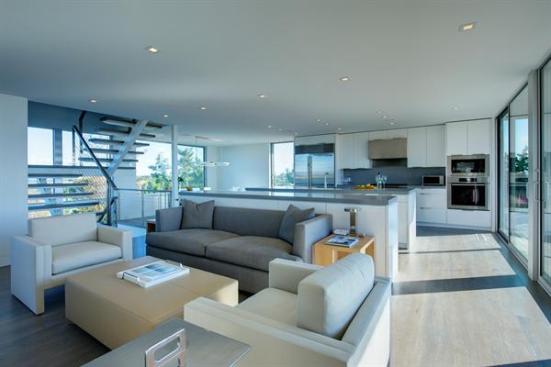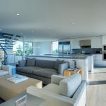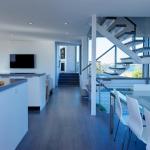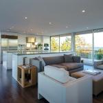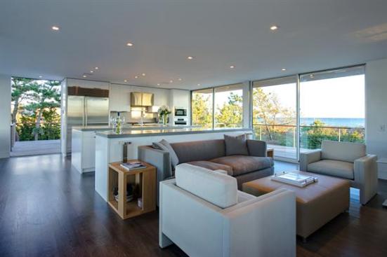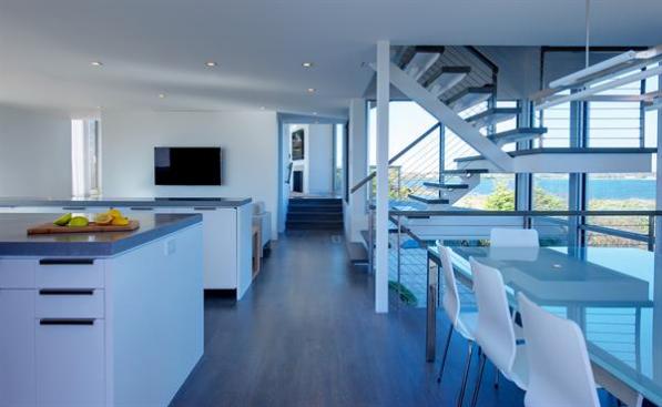 For this kitchen remodel, the challenge was making adjacent areas—dining room, sitting room, kitchen, staircase—all relate to each other while maximizing the spectacular beach views. The house gets light on all sides; tracking the sun throughout the day is one of the greatest pleasures of being here. Two parallel 10-foot work islands front the cooking space, and the entire living area is in the cook’s line of sight. The kitchen is a workhorse, to be sure, but because it’s completely exposed, simple and elegant finishing is also key. White lacquered cabinets, polished concrete countertops, and deluxe stainless appliances do the trick nicely, while sliding glass doors and an oversized pocket door to the left of the fridge help blur the line between indoors and out, making this consummate entertaining kitchen the focal point of a beach house that’s a heavenly place to be.