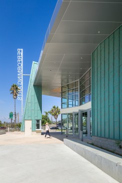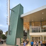 – Broad roof overhang provides protection from sun and rain and reduces glare while promoting indoor/outdoor use of lobby with natural ventilation.