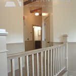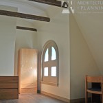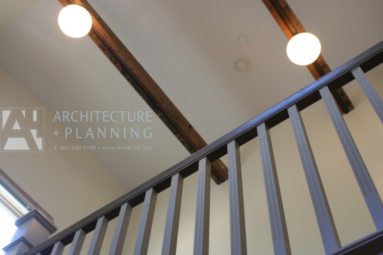 Working closely with the facilities staff of Salve University, the architects figured out a way to neatly fit the necessary program into the structure along with the living area, kitchen and other spaces that were required. At the same time, the firm worked hard to keep the traditional character of the building intact, even as the entire infrastructure was upgraded or replaced. At the ground level, a polished concrete floor similar to the one original to the carriage house was installed, only with radiant heating buried within it to achieve a very high level of fuel efficiency. The dormers on the second level were expanded just enough to allow for new egress code compliant windows to be installed, but not so much as to change the appearance o f the building. The old carriage house door was refinished and installed into the open position to give historic character to the living space and a new glass storefront was built to be the translucent image of the original door in the closed position but allow for light and entry.