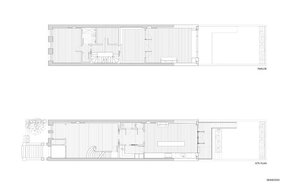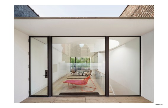 At the fourth-floor lounge area, floor-to-ceiling glazing is deployed at front and rear; it is supplemented on the lower floors by expansive windows facing the rear yard to increase the presence of natural light throughout the space.