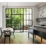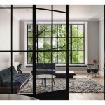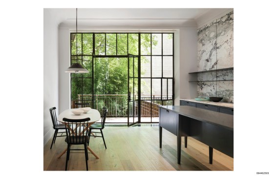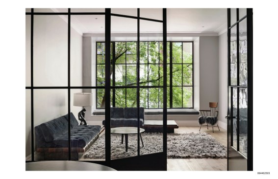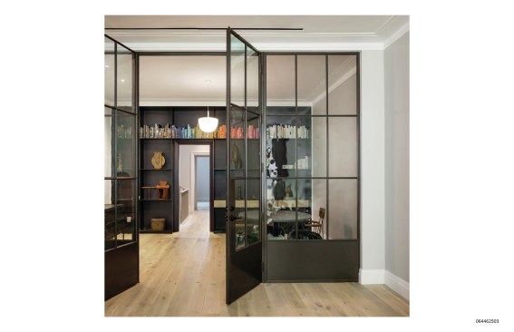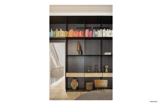 Light-colored painted-plaster walls, light-stained custom wood floors, and thin, minimal balusters on the stairs walk the line between modern and traditional design, while enhancing the reflection and filtering of daylight. While light was critical to the project’s success, the architects don’t shy from dark colors: Narrow-mullioned black windows are reprised as room-dividing partitions and custom black kitchen cabinets and built-in bookcases also punctuate the spaces.