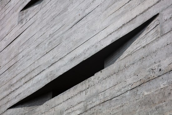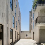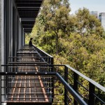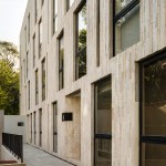 The building is structured on the basis of partition walls with rigid frames and reinforced concrete walls. On the corridor of the tower that faces the street there is an exposed concrete façade with vanishing apertures that appears as concrete scratches, and contrast with the white interiors¨. The rest of the facades are cladded with vertical travertine stripes through diverse widths, producing a constant play of light and shadow.