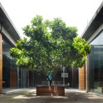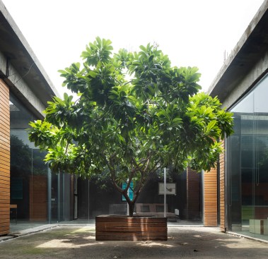 From an approach that appears like two equal volumes, the visitor walks through the open elongated alleyway. Winding like a miniature maze, the streets offset the frames achieved traditionally through these passages while exposing the visitor to glimpses of the product displays on either side. The passage narrows down with beams overhead behaving as shading pergolas till they reach the courtyard deep within the experience center and office space. A Champa (Frangipani) tree crowns the court with a sitting ledge around it made from reclaimed wood used from the clients older properties. The same wood is used to clad selective columns in order to hide some retrofitted services and drain pipes. Reminiscent of streets in India with open drains, the outdoor spaces are lined with a pebble filled trench functioning as the rain water channel.