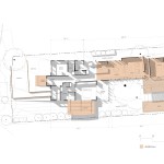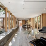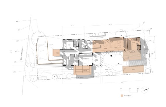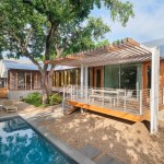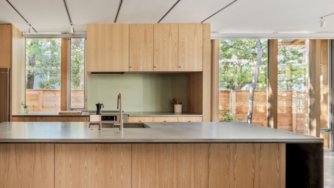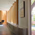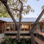 As there were two heritage live oak trees occupying the center of the rhombus-shaped property, the architects expanded out the back of the house, positioning the addition parallel to the side yard setbacks and adjacent to the trees before extending a deck and lap pool area behind the trees as if to envelope them in a private courtyard. The addition essentially doubles the kitchen size and flows into an open plan dining zone and living room with a fully glazed wall facing the heritage trees. A 36-foot-long cantilevered concrete bench runs along this wall allowing one to sit and look outside perhaps in quiet contemplation. At the very back of the addition is an enclosed studio, a bath, sauna, and the aforementioned outdoor deck and pool.
