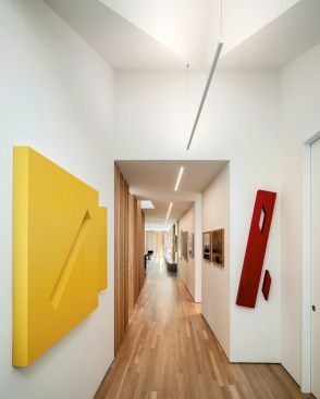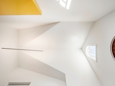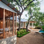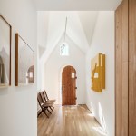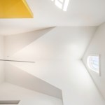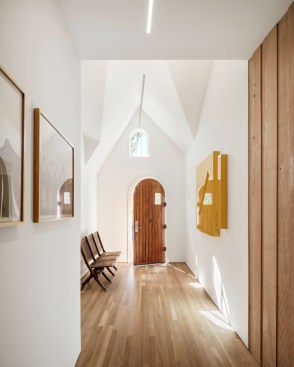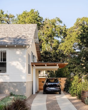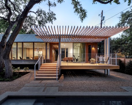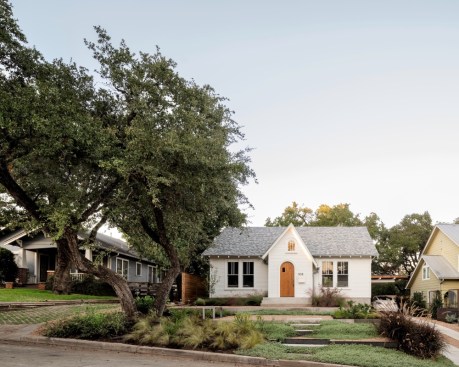 On a recently established one-block-long historic district in Austin, Texas, the architects faced the challenge of balancing preservation with renovation and expansion of a derelict asymmetric 1930s storybook cottage. To start, they restored the exterior of the quaint front entry, but just inside, they opened the flat ceiling to reveal the gable’s quirky and complex roof structure with white modern planes. A linear uplight is suspended in this space and is followed by LED strips set flush in the ceiling, all in alignment, down the house’s skewed central corridor.